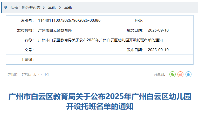 见告指出,凭据《广州市东说念主民政府办公厅对于广州市3岁以下婴幼儿照护职业体系斥地三年手脚探究(2023-2025年)的见告》(穗府办〔2024〕3号)、《广州市白云区3岁以下婴幼儿托育职业职责联席会议办公室对于印发白云区3岁以下婴幼儿照护职业体系斥地两年手脚探究(2024—2025年)的见告》精神,对照《广州市幼儿园开设托班职责指示(试行)》条款,经幼儿园肯求,白云区诠释局组织各诠释领导中心进行材料审查和现场梭巡,并报送白云区卫生健康局审查,高兴广州白云区永平第七幼儿园等183所幼儿园开设托班,有用期为一学年(2025学年秋季、2025学年春季),入托年事为2-3岁,班额上限为20东说念主/班。请各幼儿园严格按照强劲例模进行招生办学,配皆配足保教东说念主员。凡不在真名单中的幼儿园,均无开设托班天禀。