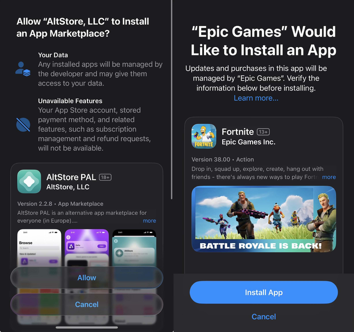 日前,苹果向开辟者推送了 iOS 26.2 的首个 beta 版块,博主 @Tzzlala 昨天在 X 上发帖称,日本用户已可在运行 iOS 26.2 的 iPhone 上装配替代应用程式商店,包括 AltStore PAL 与 Epic Games Store。
