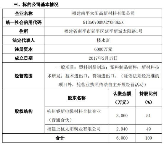 中国经济网北京12月13日讯 杭州高新(300478)(300478.SZ)昨晚知道的对于筹备首要财富重组暨签署意向合同的请示性公告明白,公司正在筹备以支付现款购买财富的姿首向杭州睿新电缆材料合资企业(昔时合资)(以下简称“杭州睿新”)收购其所抓有福建南平太阳高新材料有限公司(以下简称“太阳高新”或“方向公司”)51%股份事宜。抓有方向公司49%股份的福建上杭太阳铜业有限公司(系福建南平太阳电缆(002300)股份有限公司控股子公司,以下简称“太阳铜业”)喜悦烧毁方向公司股权的优先购买权。本次往返完成后,公司将获取太阳高新的扫尾权,太阳高新将成为公司的控股子公司。